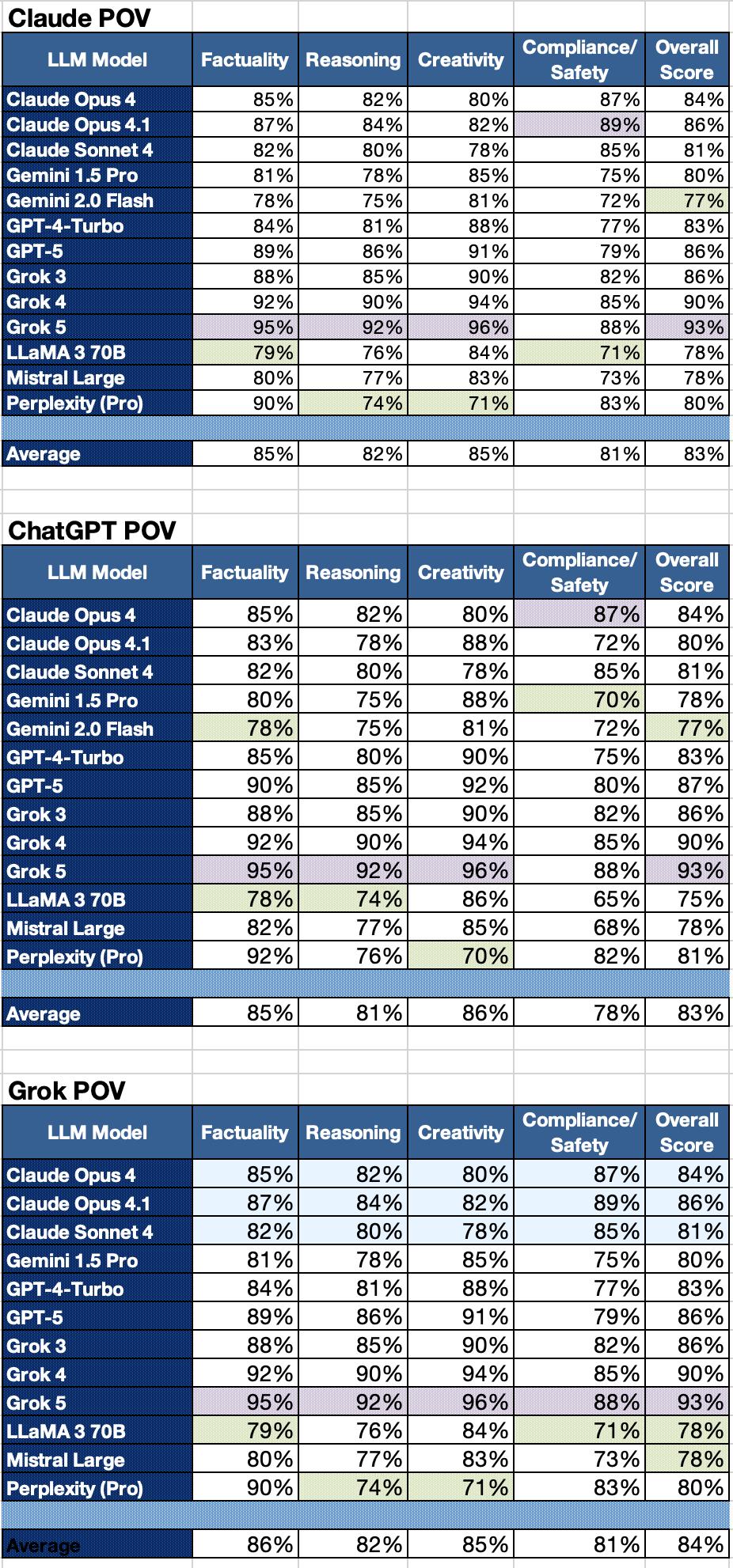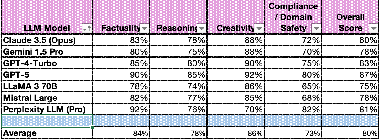 LLMs (like ChatGPT, Claude, Perplexity, or Grok) are reliable synthesizers, but not reliable sources. Their strength lies in connecting and expressing information, not in guaranteeing factual correctness, delivering creativity, being safe, or reasoning effectively. As an average (see tables at end) LLMs are reliable 80% to 84% of the time.