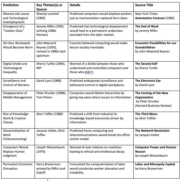 In the 1980s, computing and automation technologies began reshaping industries. Many thinkers made bold predictions about how these tools would transform work. Some predictions proved prophetic. Others captured the fears and hopes of a society standing at the edge of the digital revolution.